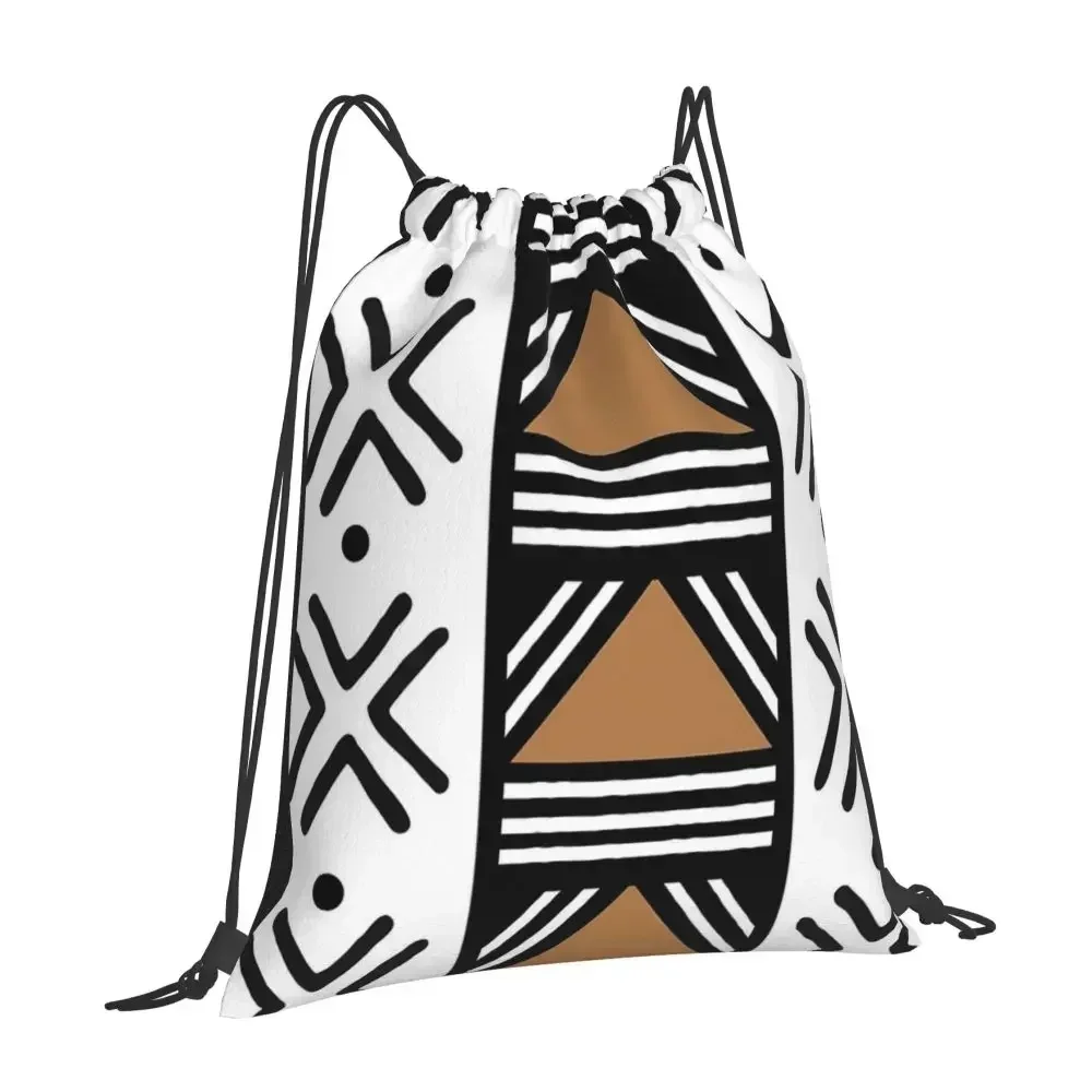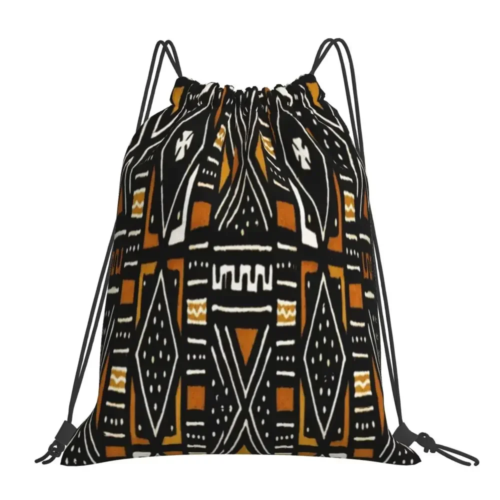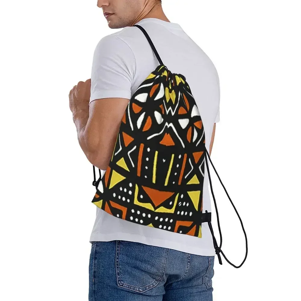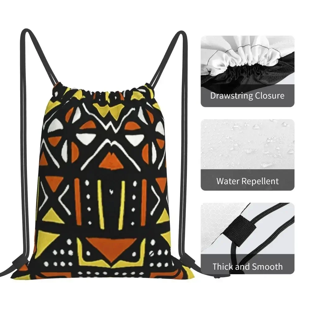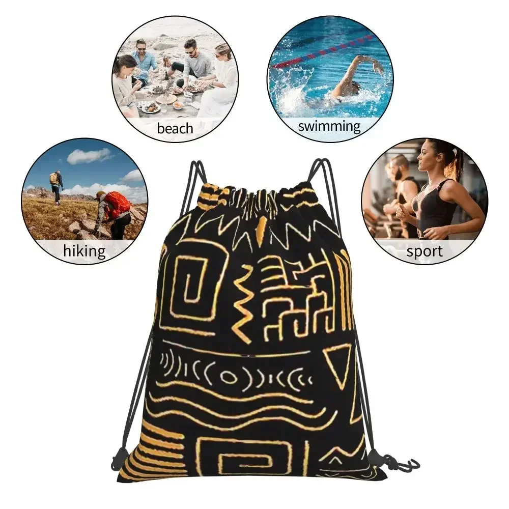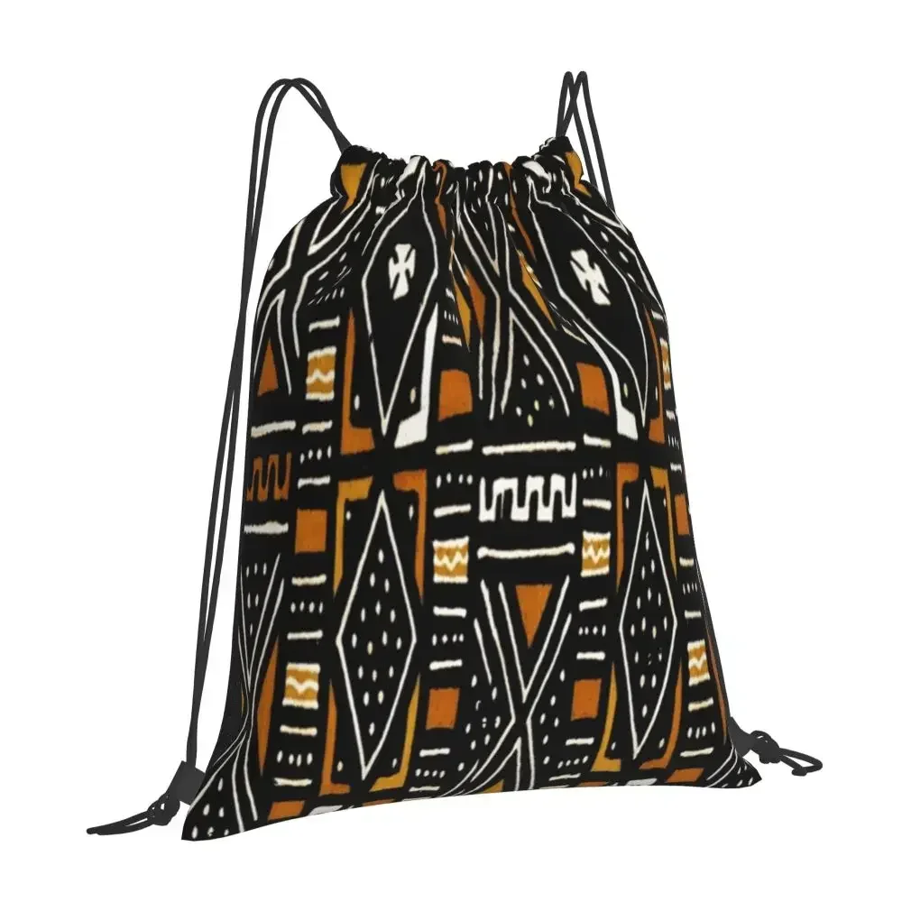 African Tribal Bogolan Pattern Backpacks Portable Drawstring Bags Drawstring Bundle Pocket Sports Bag BookBag For Travel School