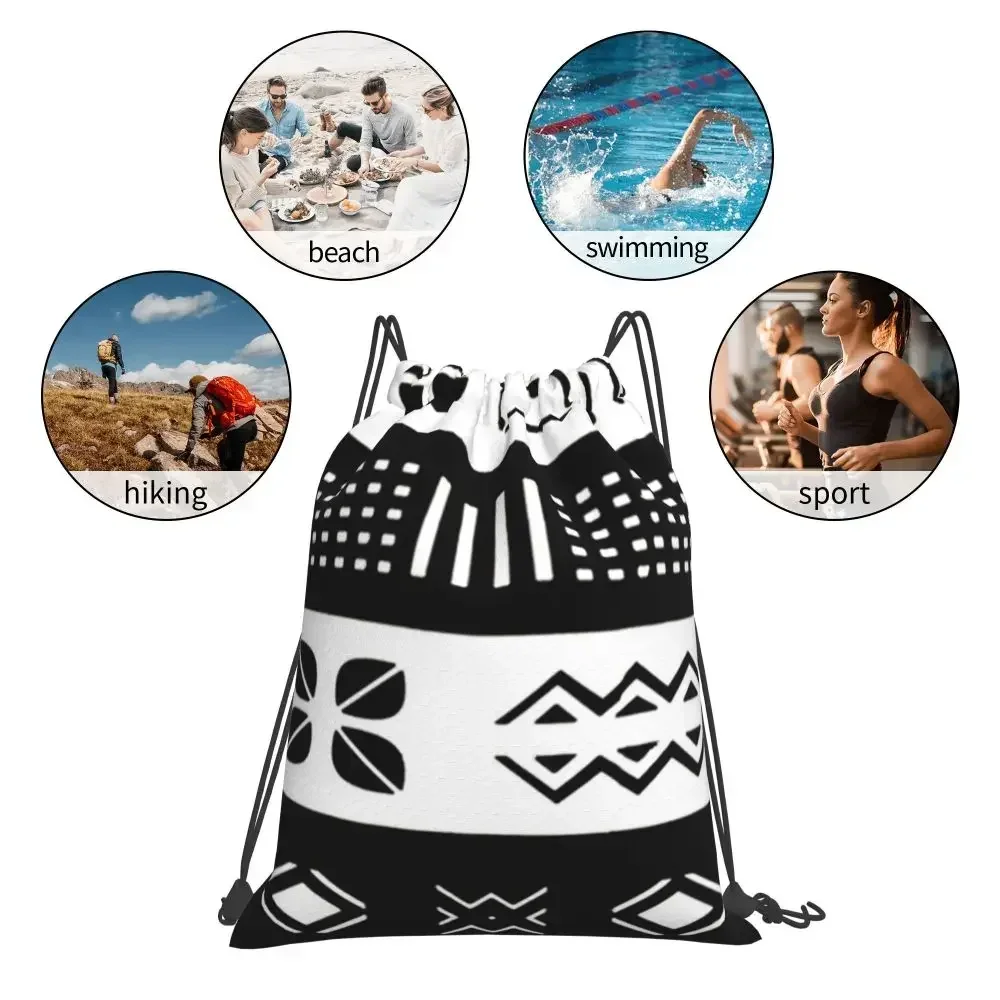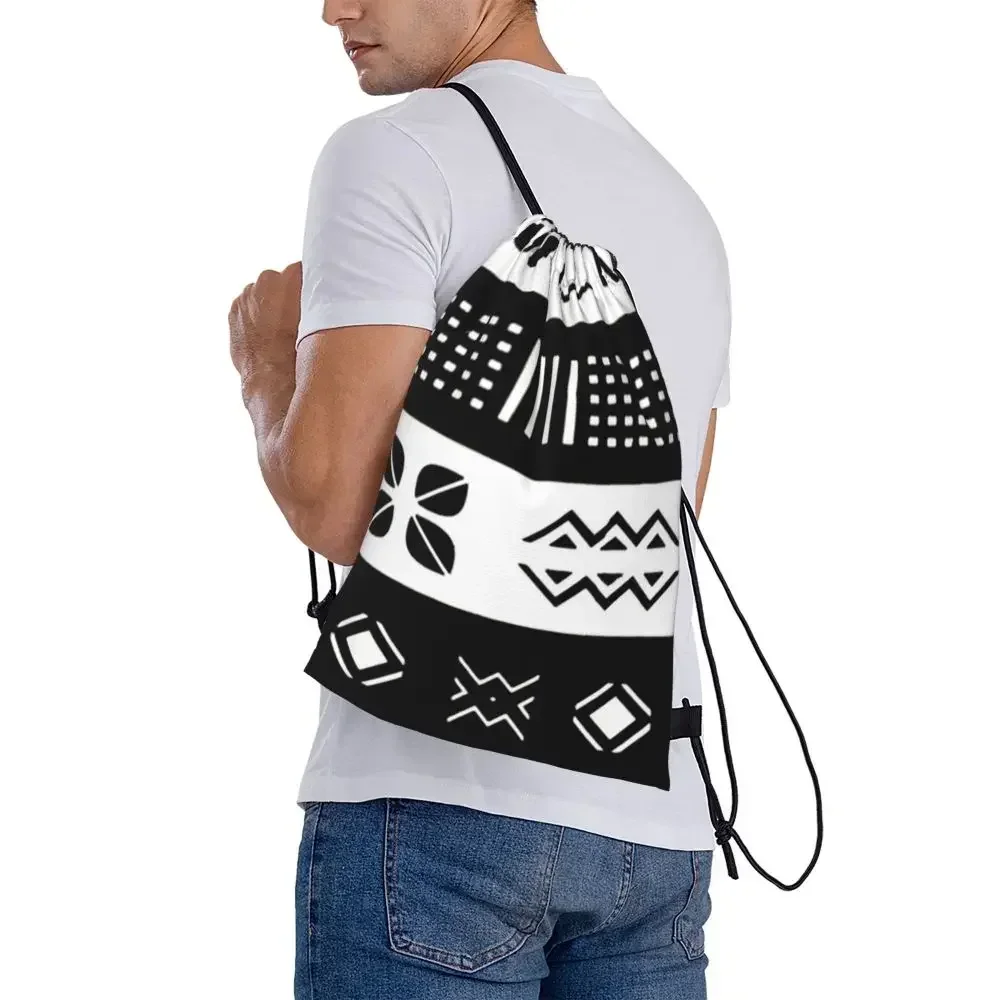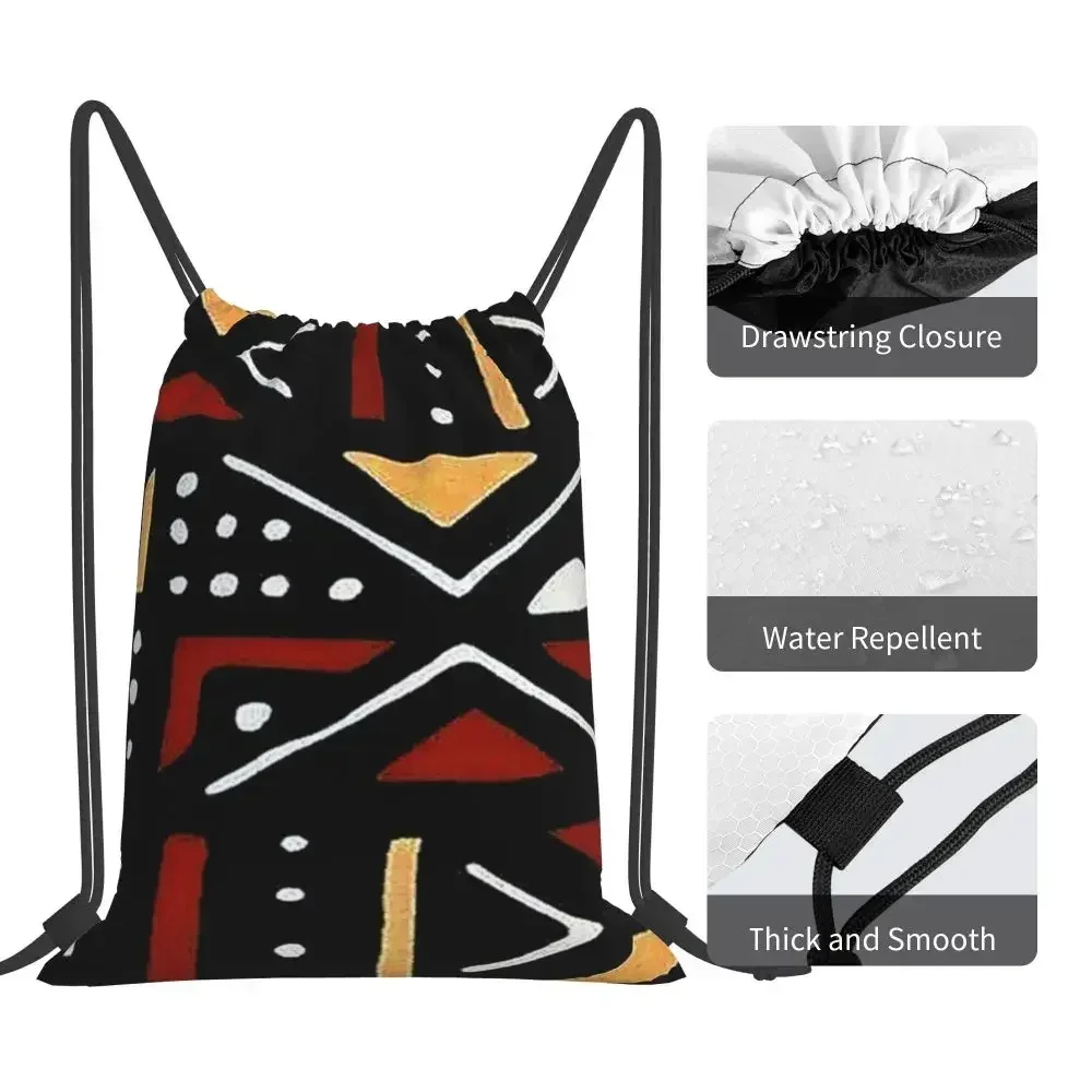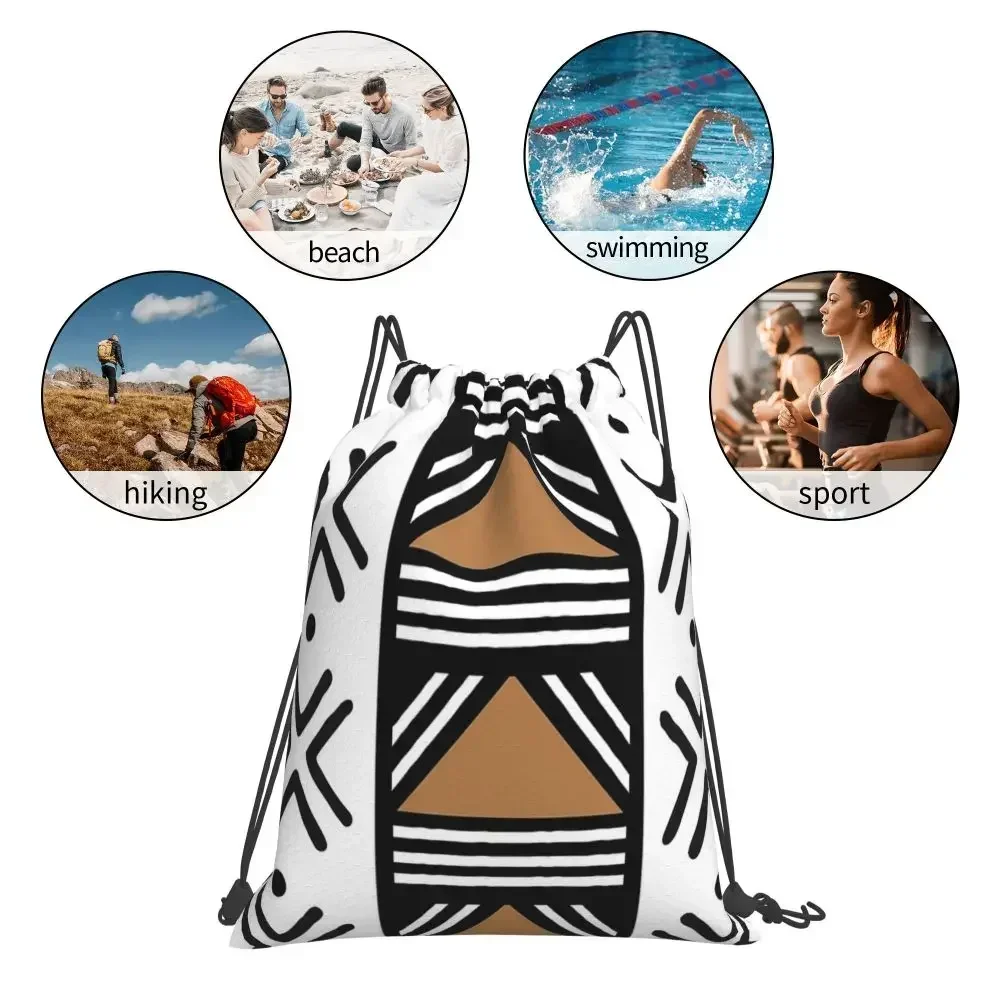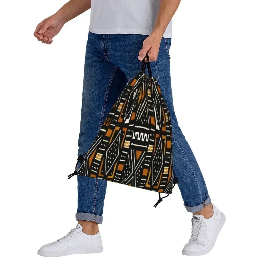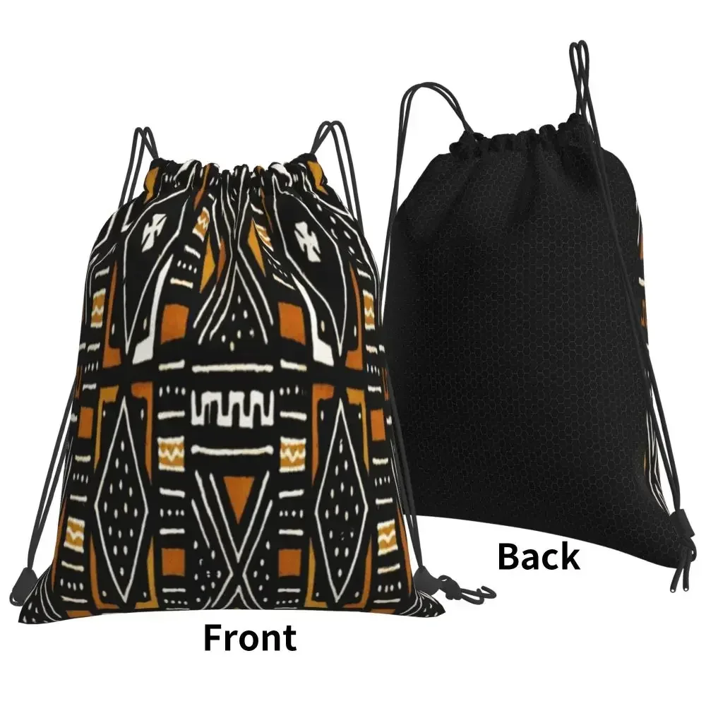 African Tribal Bogolan Pattern Backpacks Portable Drawstring Bags Drawstring Bundle Pocket Sports Bag BookBag For Travel School