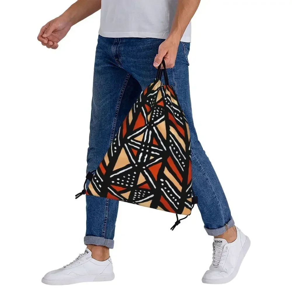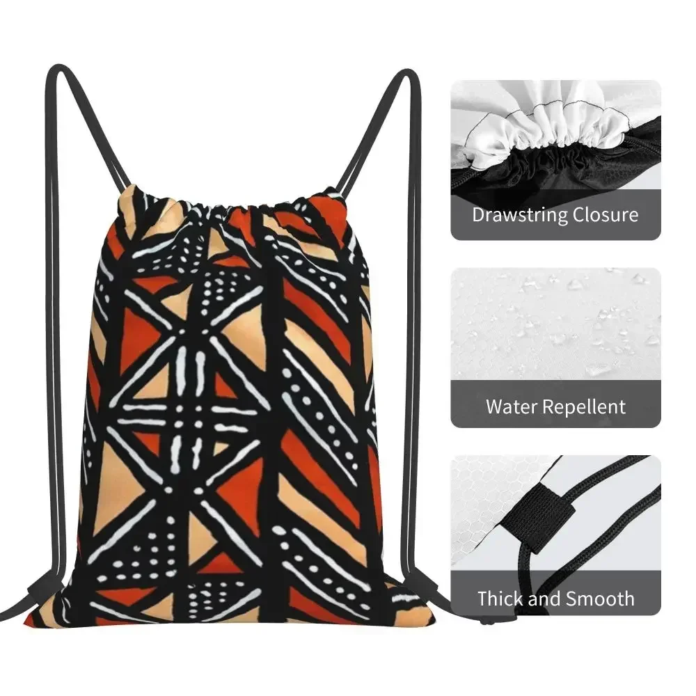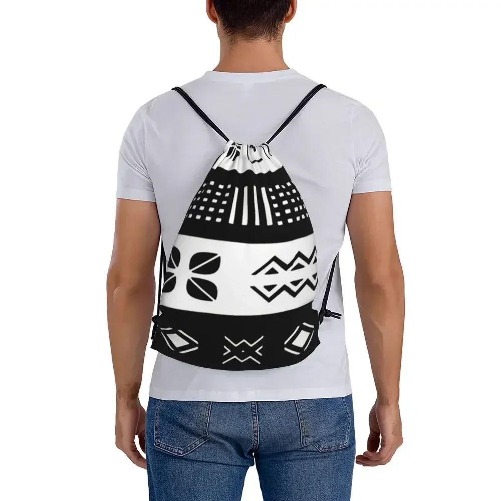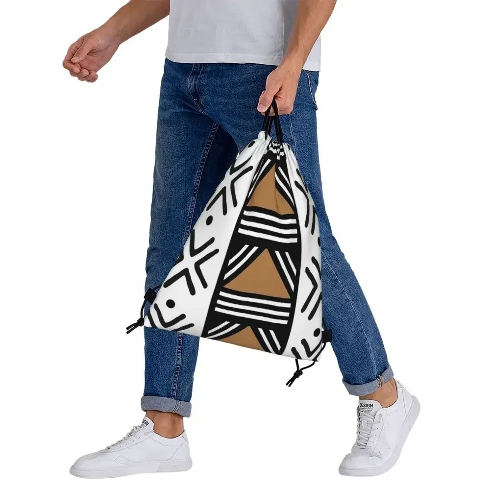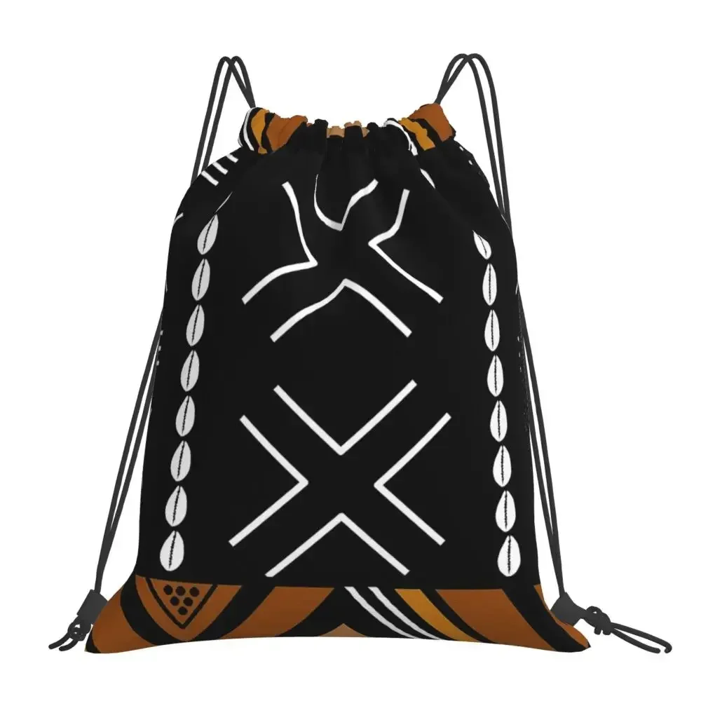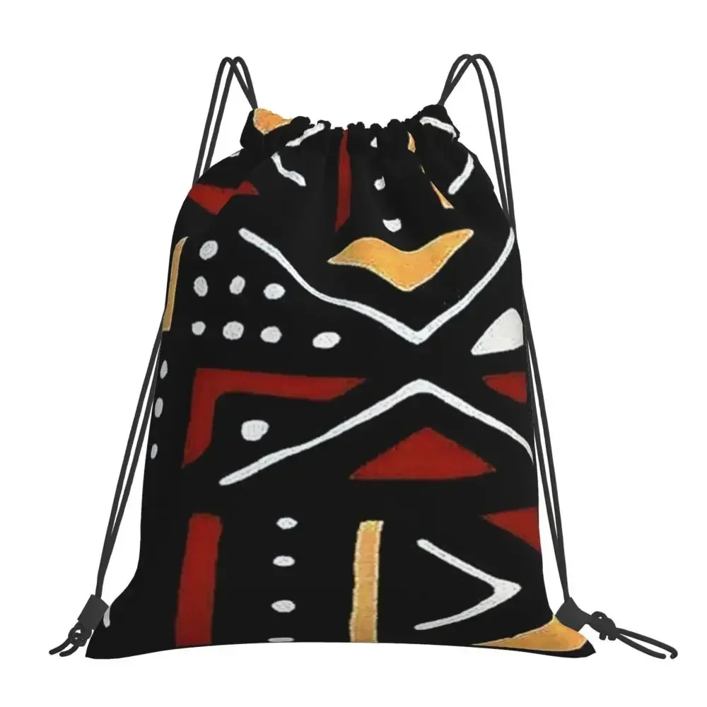 African Tribal Bogolan Pattern Backpacks Portable Drawstring Bags Drawstring Bundle Pocket Sports Bag BookBag For Travel School