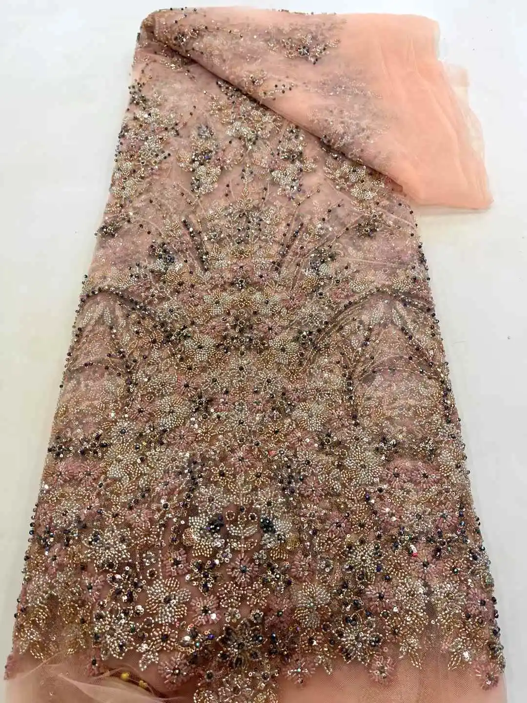 This lace is absolutely stunning! The beading and sequins are so intricate and sparkly. It feels really luxurious and high quality. Perfect for making a show-stopping dress. I can’t wait to work with it!